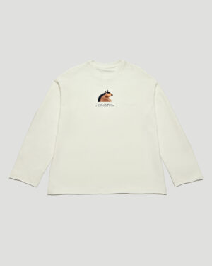 A cream longsleeve with the proverb “Let the horse think, it has a big head” (implying it’s not your burden to overthink).